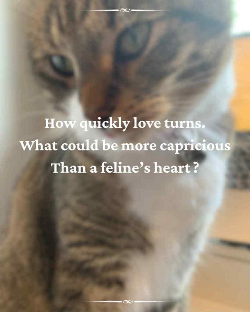 I’ve also started a series I’m calling “Melodrama Mondays”, in which I write overly melodramatic haikus every Monday. This is part of a long game because in like, over a year (after I finish the third Sorceress and Scones book), I want to write a story in which the main character expresses herself through excessively melodramatic poetry, and have the little in-between chapter bits be poems. So, I’m doing this as practice. Also, I discovered that writing excessively melodramatic haikus is a lot of fun. Here’s my favourite one from last month, about my friend’s cat that I’m cat-sitting, and his “biting face”.
