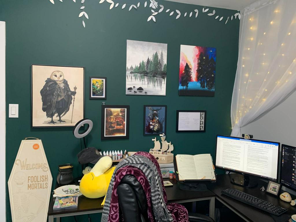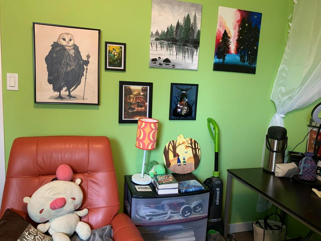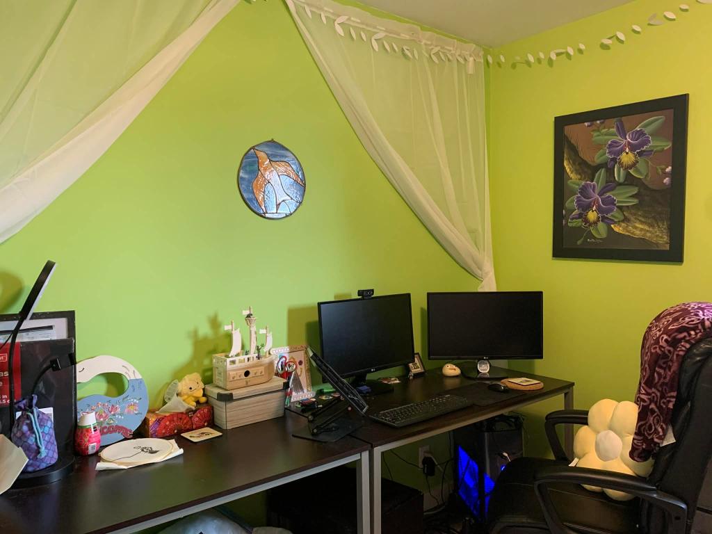 As mentioned earlier, I previously made…questionable decisions about paint colours. I wanted the room I wrote in to have a chill, forest-y vibe. I proceeded to pick like a child-funhouse level shade of green. This is what it looked like before.