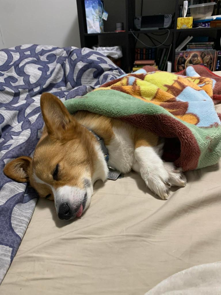 Millie was VERY sleepy after meeting my friend’s new dog. My girl adores people, but is more hesitant with other dogs. However, my friends were adopting this dog and they wanted to make sure she was okay with other dogs before finalizing things, because they eventually want to get a second dog. So, they asked if we could bring Millie over. We did, and Millie was very good. She did a little lip curl a few times when she got a little overwhelmed but overall she was nice to the dog, even if the other dog clearly wanted to play with her more than she did. But the other dog was very nice with Millie, so my friends were like, “yep, we’re getting her!” So my girl helped another doggie get a forever home, and I am very proud of her.