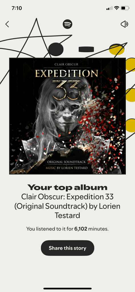 So, according to my SpotifyWrapped, I have listened to the Clair Obscur soundtrack for longer than I have played the game.
